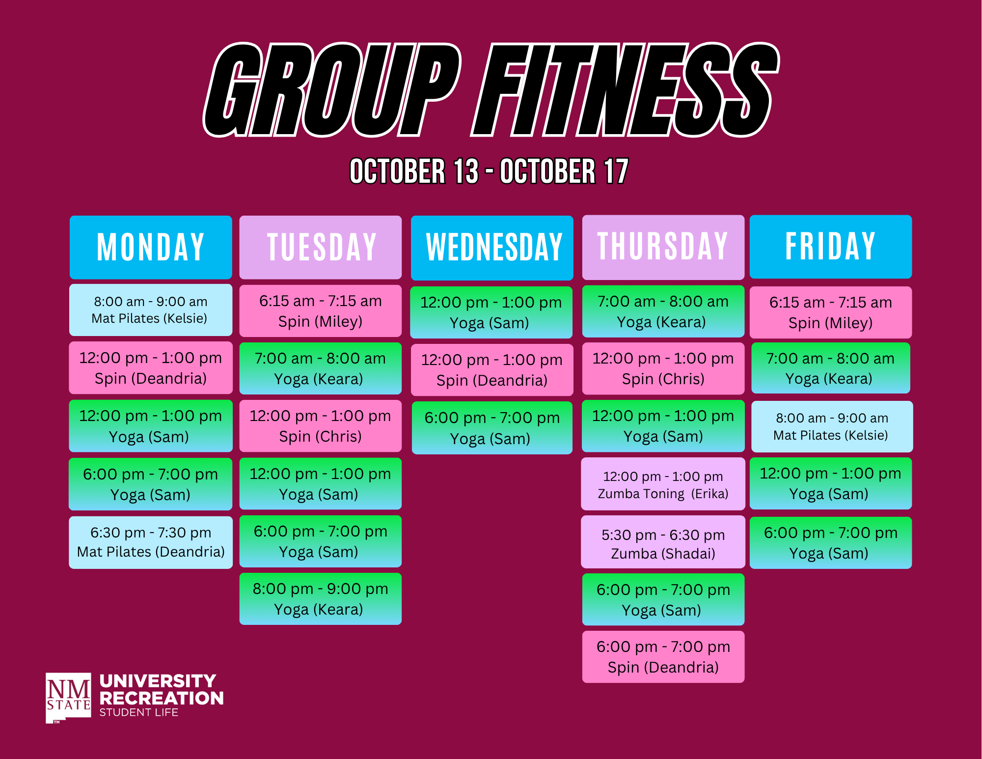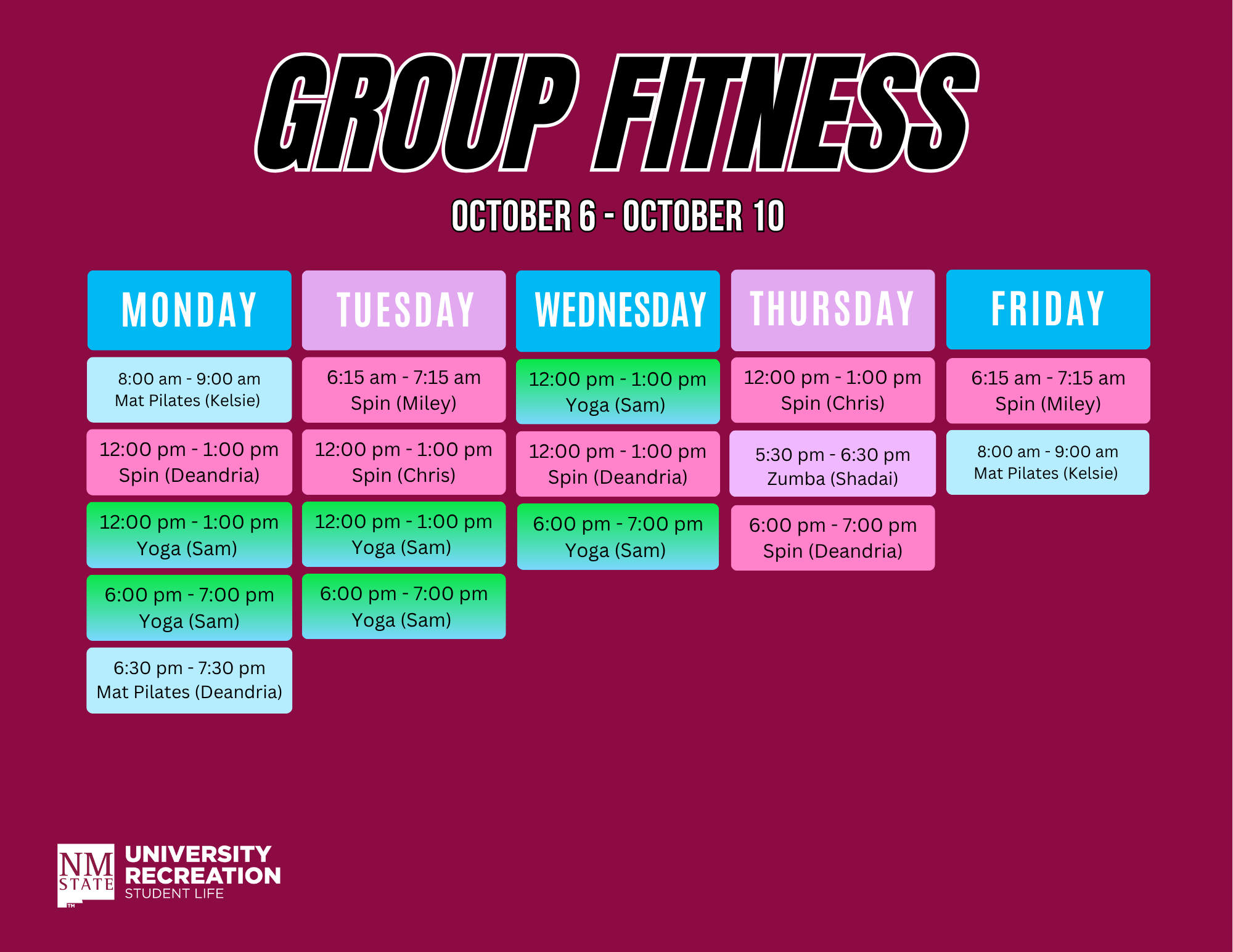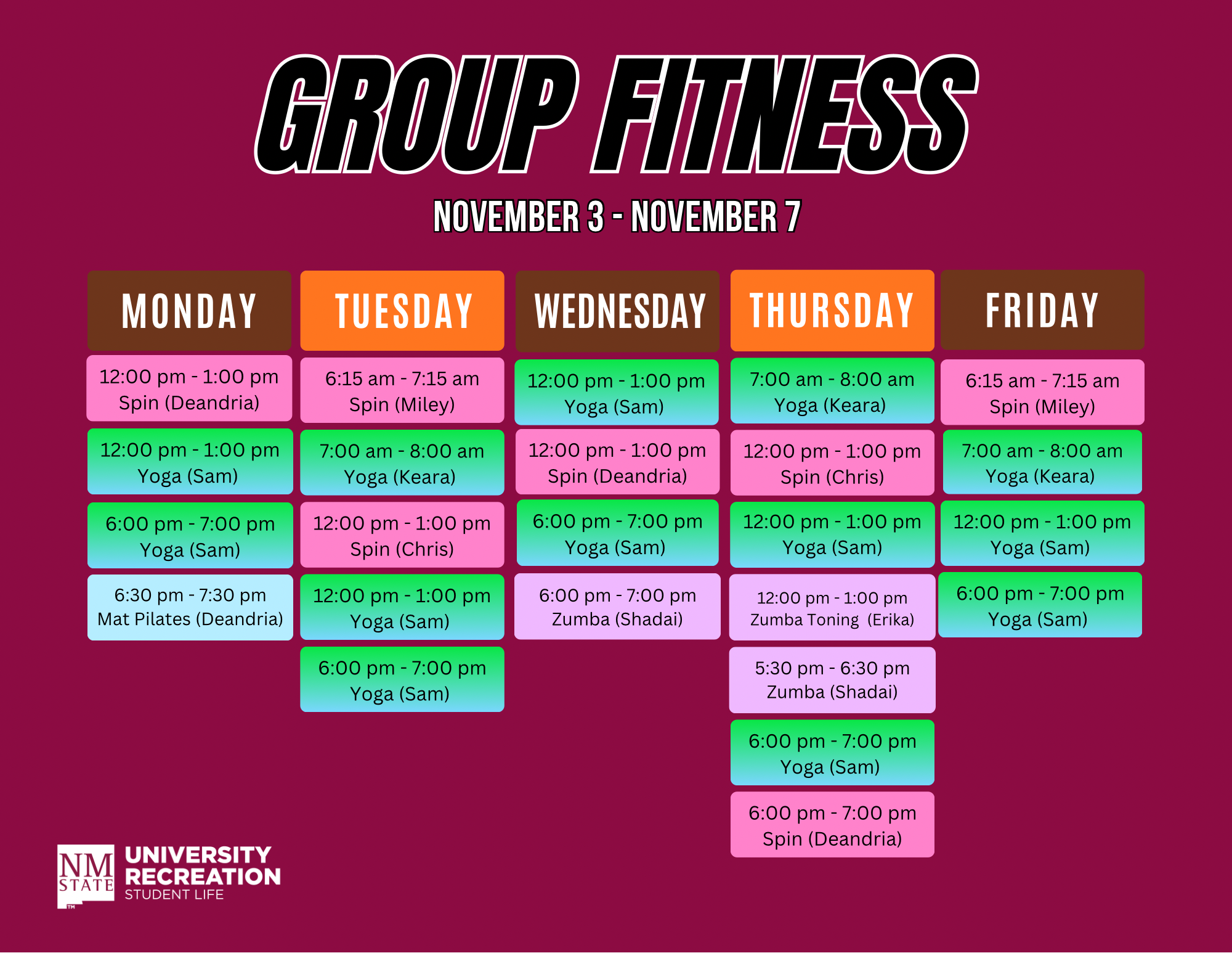 Group Fitness at NMSU offers a wide variety of structured fitness activities to meet your personal goals. Our instructors are prepared to inspire and motivate you to change and/or continue healthy fitness-related behaviors.